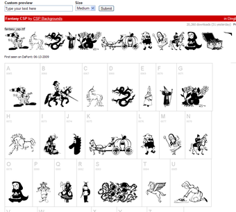 dafont.comには、精細なグラフィックの絵文字も大量に用意されています。中国風のドラゴンや古代風の文様、動物や童話キャラクターのイラストなど見ているだけでも楽しいデザインが盛り沢山です。画像サンプルをクリックすることで、キーボードのどのキーがどの画像に対応しているのかを確認できます。